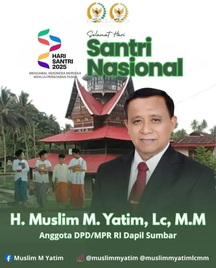 Jakarta — Anggota Dewan Perwakilan Daerah (DPD) RI asal Sumatera Barat, Muslim M. Yatim, menyampaikan ucapan selamat dan apresiasi kepada seluruh santri di Indonesia dalam momentum Peringatan Hari Santri Nasional 2025 yang jatuh pada 22 Oktober.